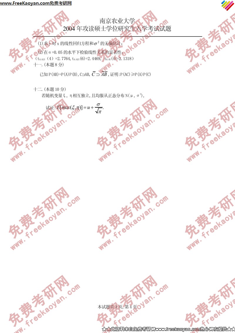 专业课考研经验 本站小编 FreeKaoyan 2018-01-23南京农业大学2004年考研真题-动物生理生化