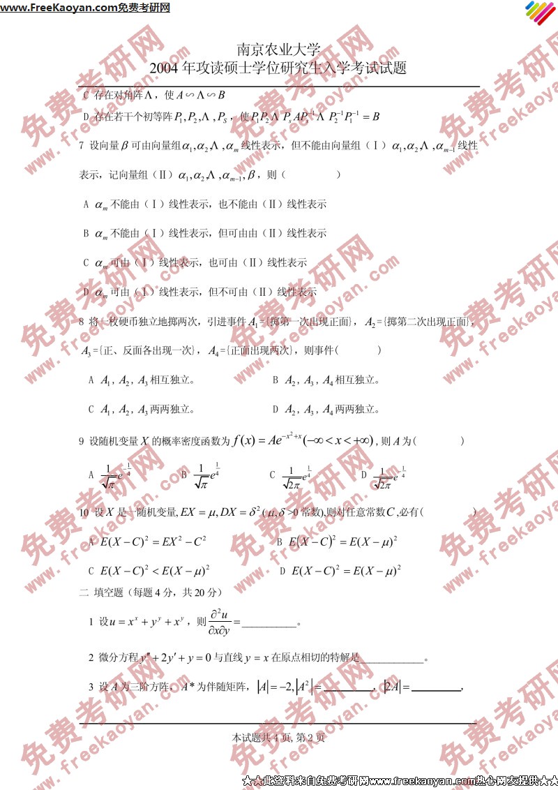 专业课考研经验 本站小编 FreeKaoyan 2018-01-23南京农业大学2004年考研真题-概率统计
