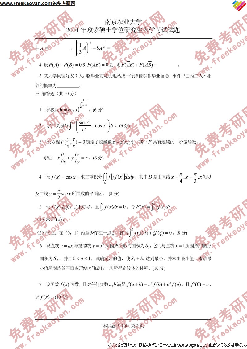 南京农业大学2004年考研真题-高等数学(3)