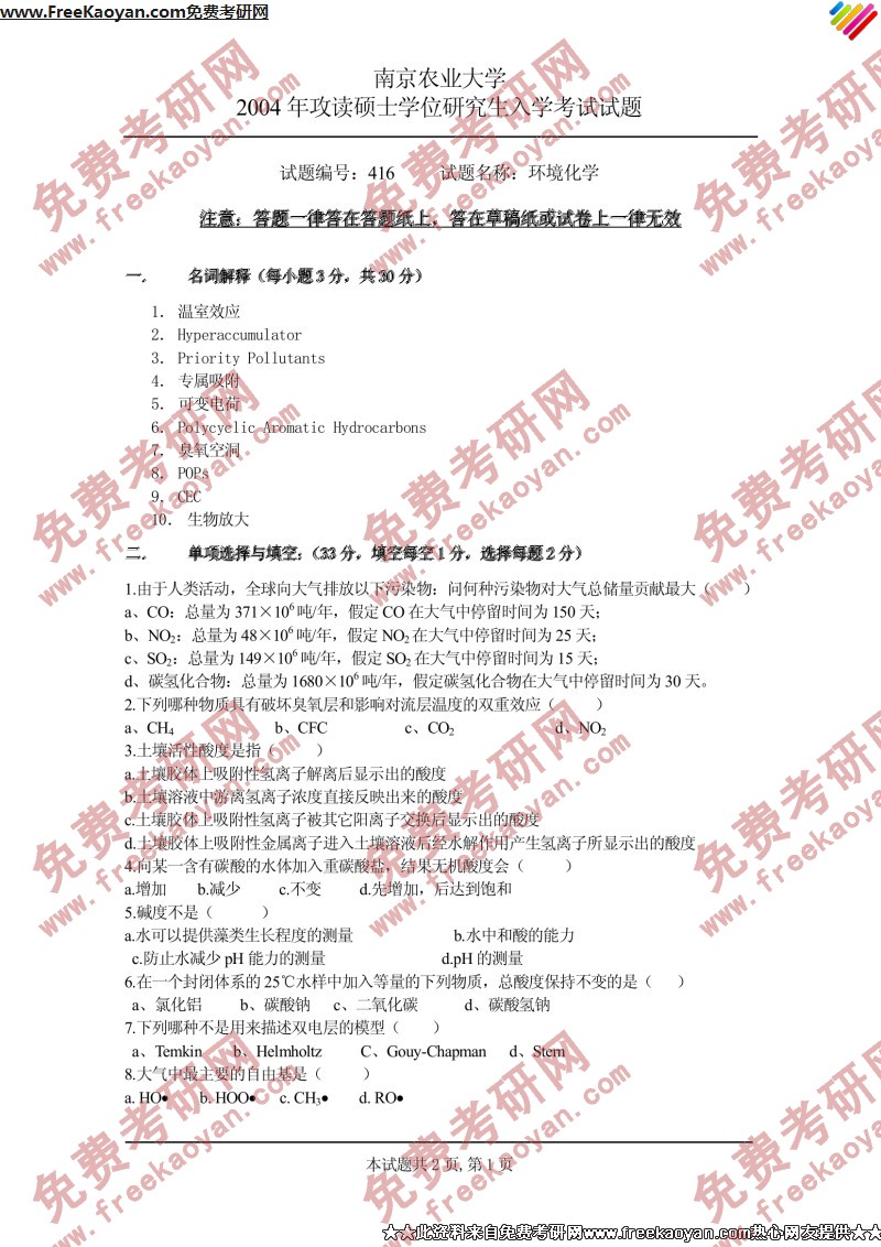 专业课考研经验 本站小编 FreeKaoyan 2018-01-23南京农业大学2004年考研真题-分析化学