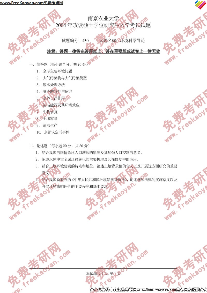 相关话题/考研真题 环境科学 南京农业大学 导论