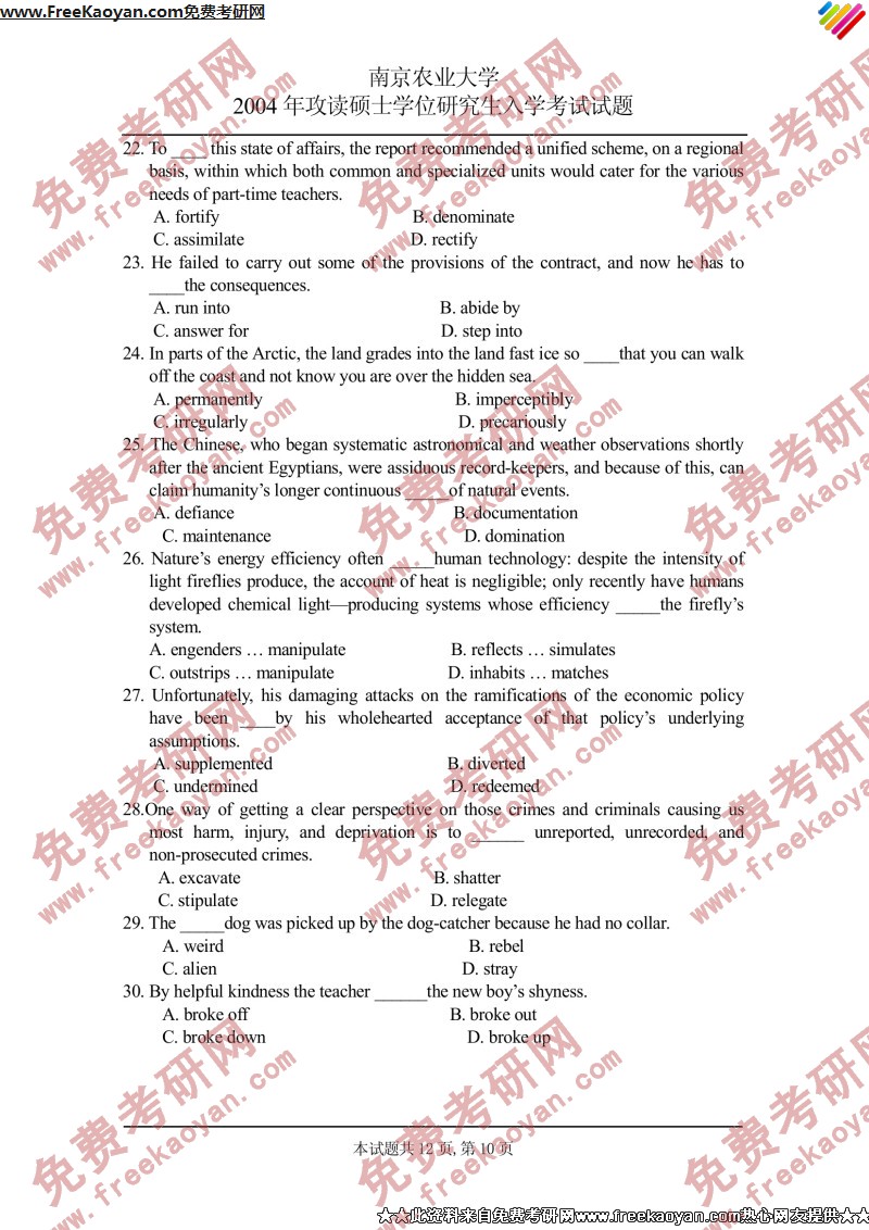 南京农业大学2004年考研真题-基础英语(10)