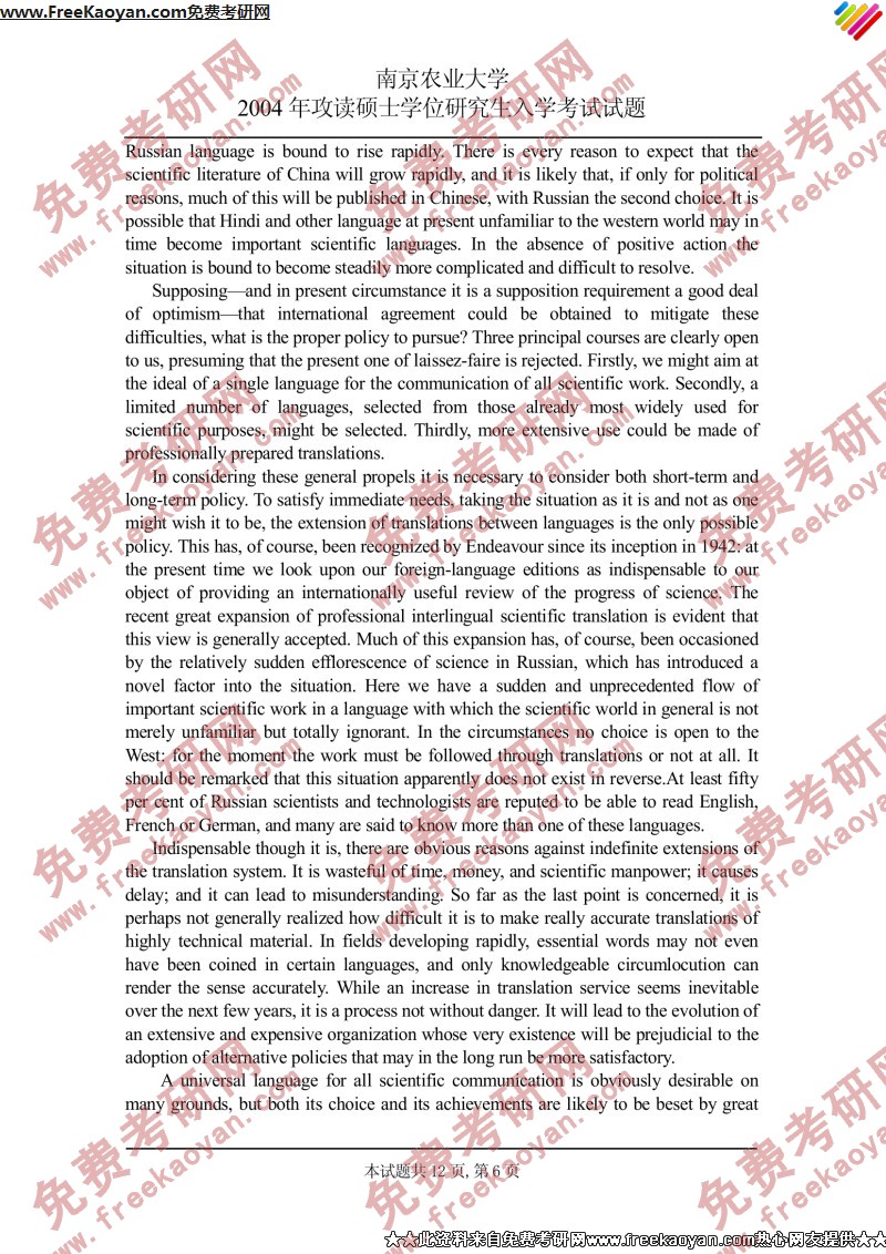 专业课考研经验 本站小编 FreeKaoyan 2018-01-23南京农业大学2004年考研真题-俄语二外