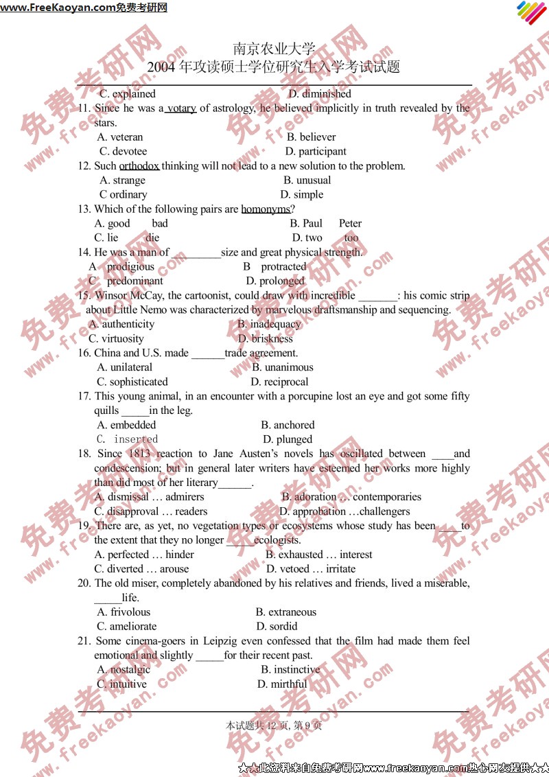 专业课考研经验 本站小编 FreeKaoyan 2018-01-23南京农业大学2004年考研真题-俄语二外