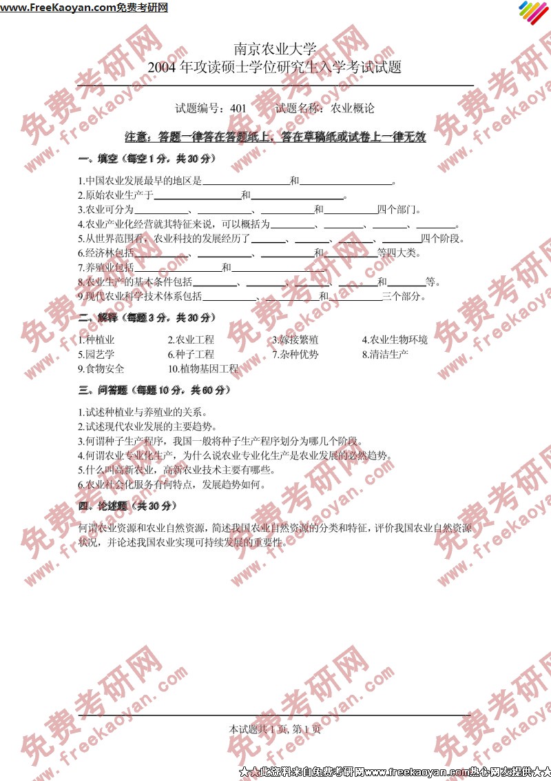 专业课考研经验 本站小编 FreeKaoyan 2018-01-23南京农业大学2004年考研真题-基础英语