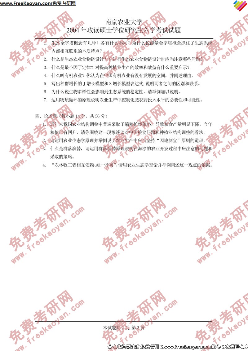 南京农业大学2004年考研真题-农业生态学(2)