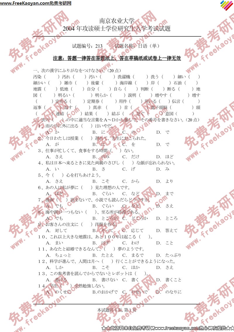 专业课考研经验 本站小编 FreeKaoyan 2018-01-23南京农业大学2004年考研真题-基础英语