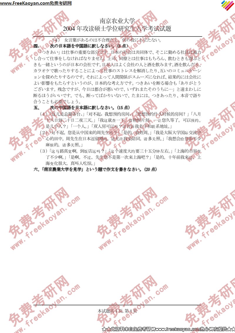 专业课考研经验 本站小编 FreeKaoyan 2018-01-23南京农业大学2004年考研真题-日语(单)
