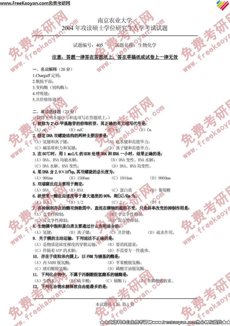 专业课考研经验 本站小编 FreeKaoyan 2018-01-23南京农业大学2004年考研真题-化学