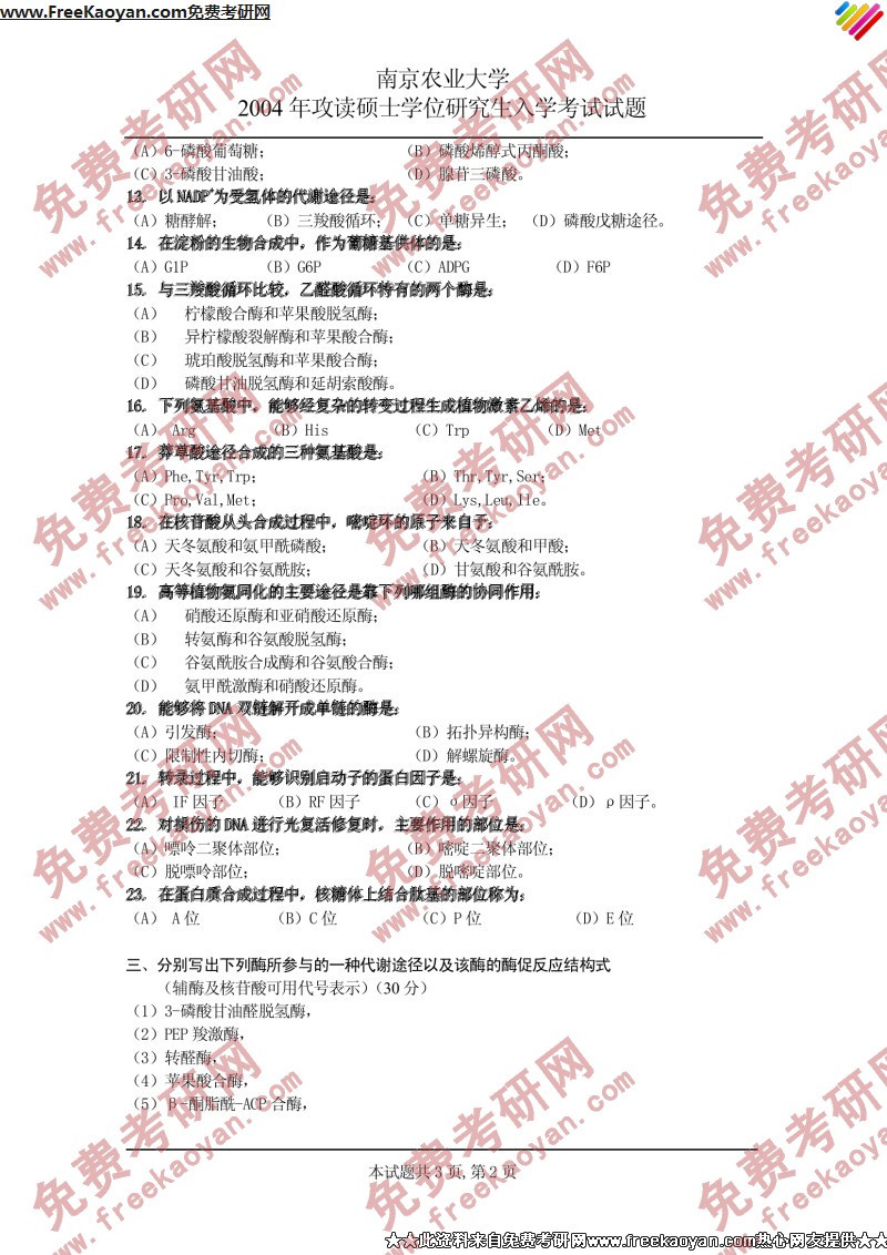 专业课考研经验 本站小编 FreeKaoyan 2018-01-23南京农业大学2004年考研真题-化学
