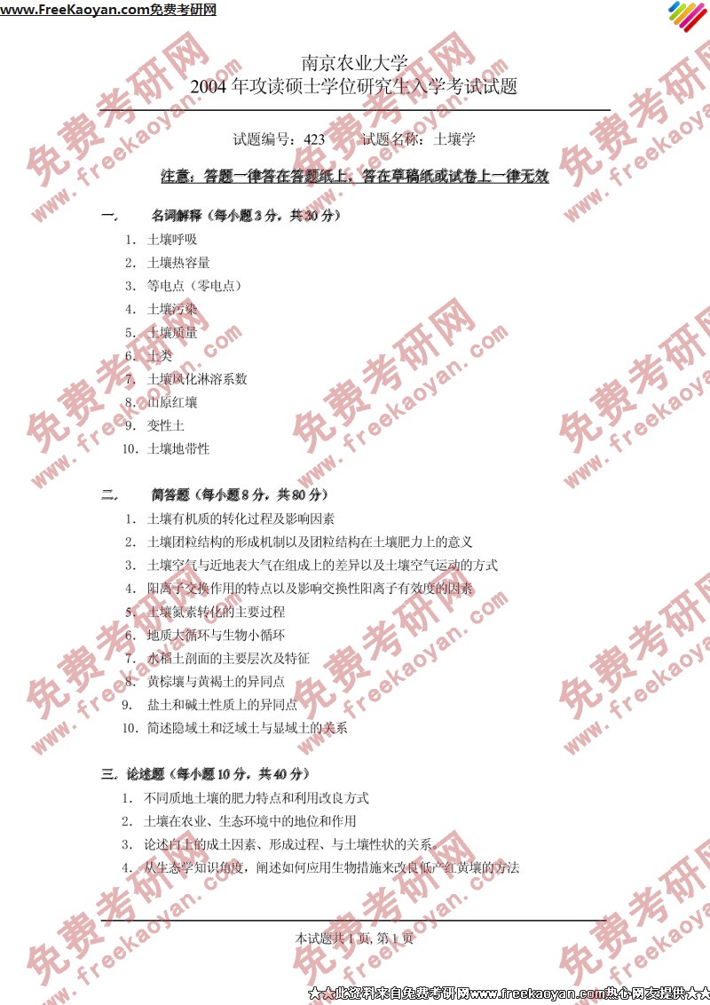 专业课考研经验 本站小编 FreeKaoyan 2018-01-23南京农业大学2004年考研真题-土壤农化分析