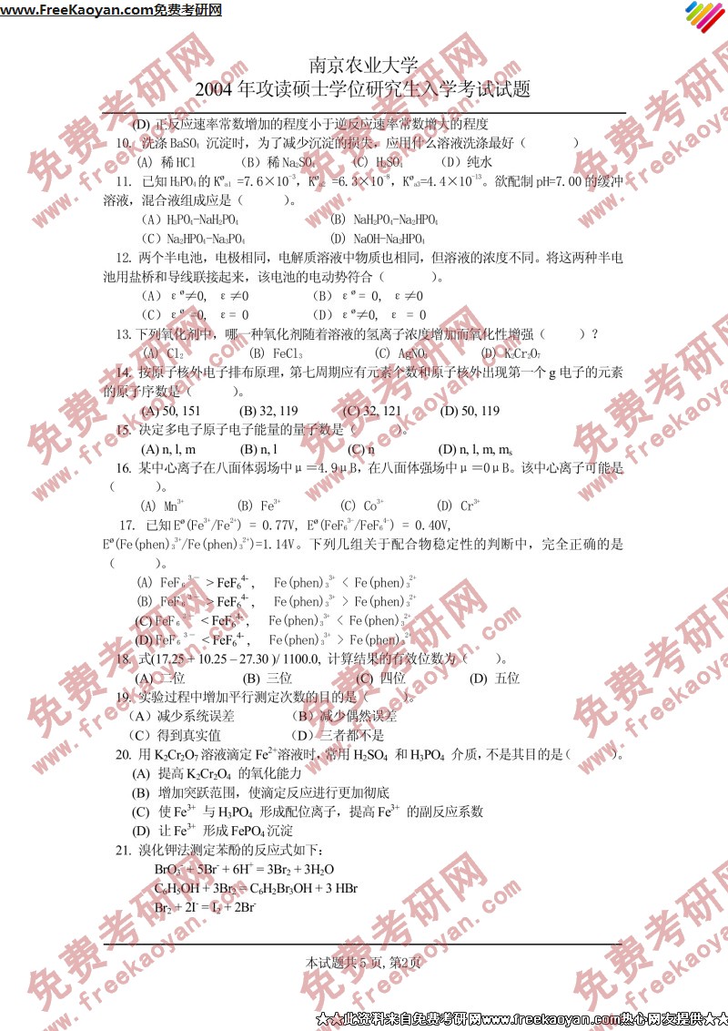 专业课考研经验 本站小编 FreeKaoyan 2018-01-23南京农业大学2004年考研真题-土壤农化分析