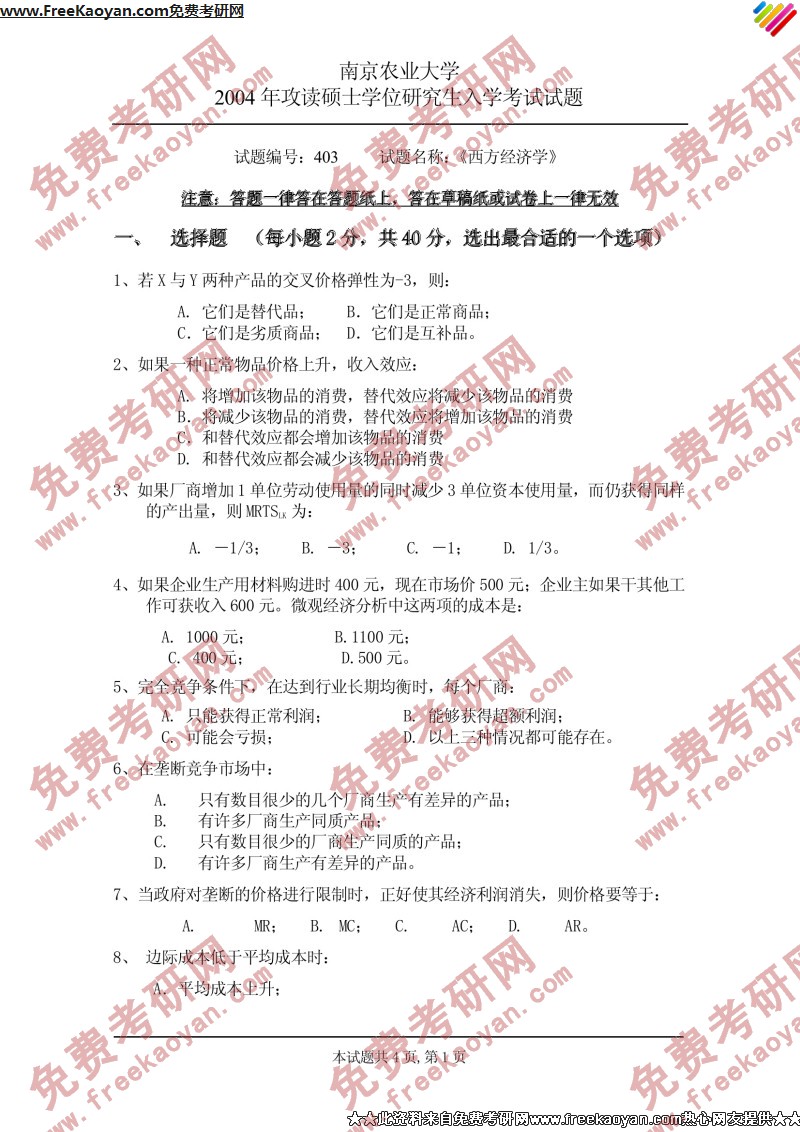 专业课考研经验 本站小编 FreeKaoyan 2018-01-23南京农业大学2004年考研真题-土地经济学