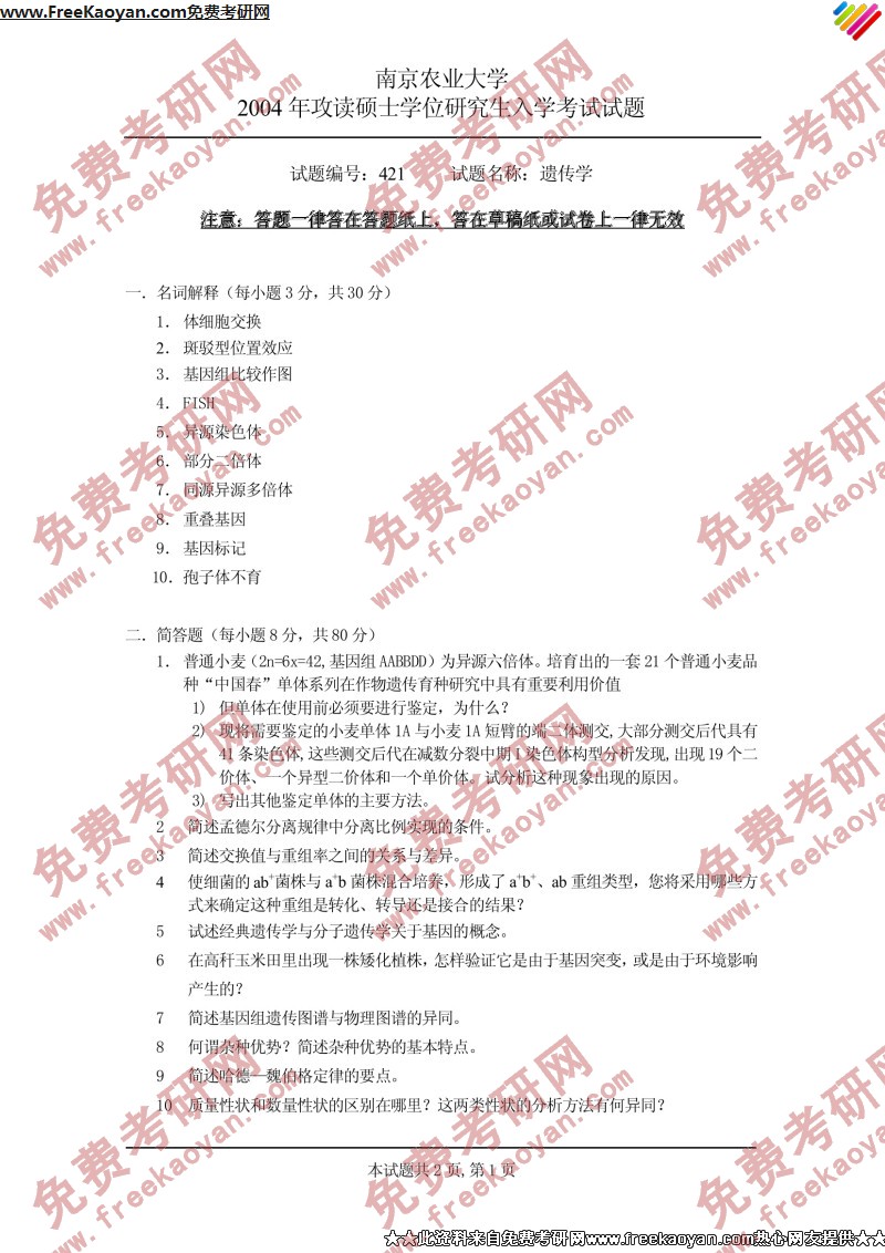 专业课考研经验 本站小编 FreeKaoyan 2018-01-23南京农业大学2004年考研真题-生物化学