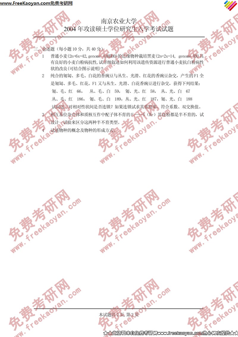 南京农业大学2004年考研真题-遗传学(2)