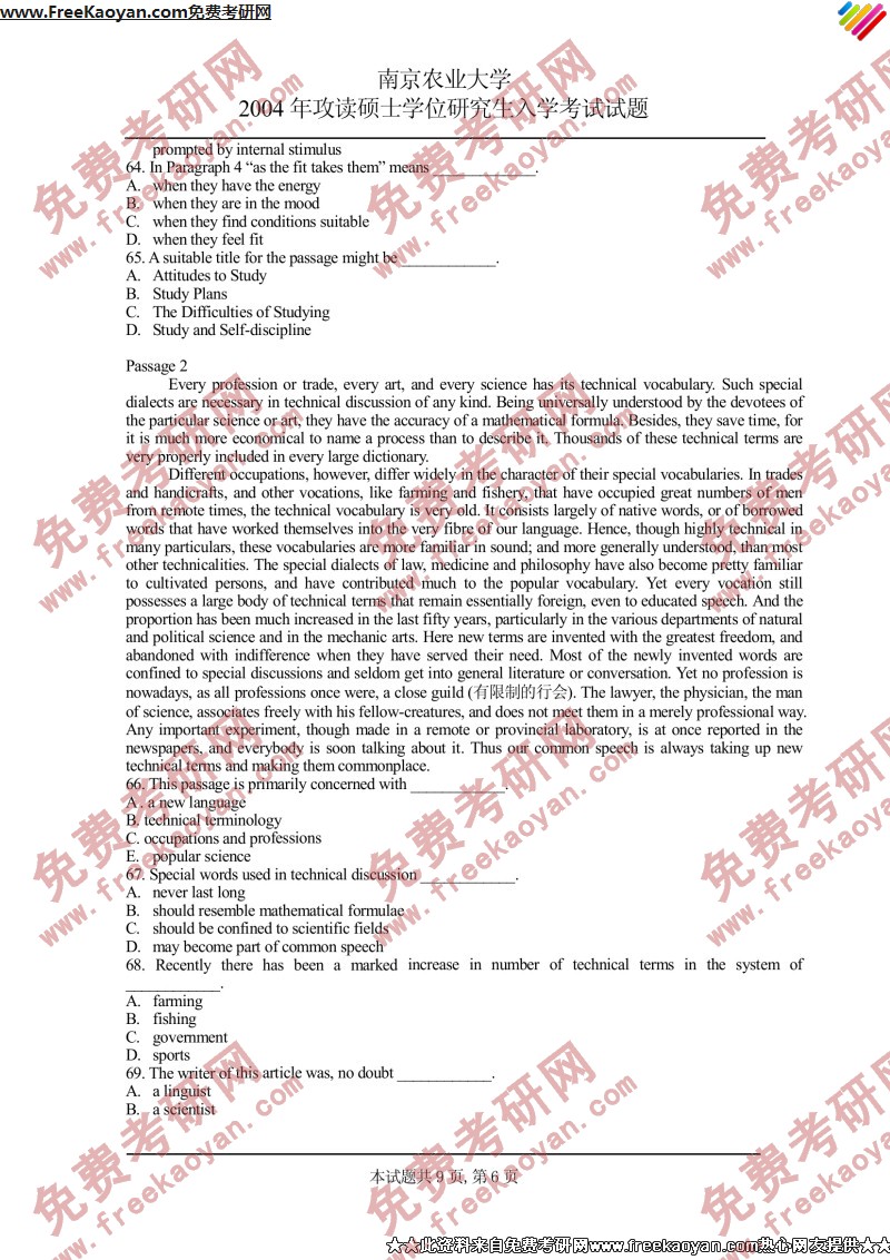 专业课考研经验 本站小编 FreeKaoyan 2018-01-23南京农业大学2004年考研真题-英汉互译