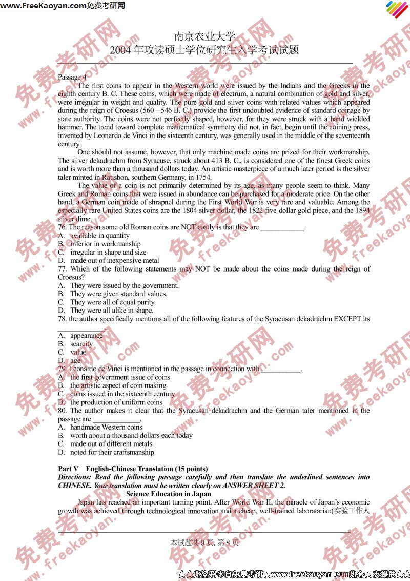 专业课考研经验 本站小编 FreeKaoyan 2018-01-23南京农业大学2004年考研真题-英汉互译