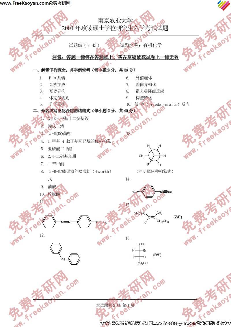 相关话题/南京农业大学 考研真题 有机化学