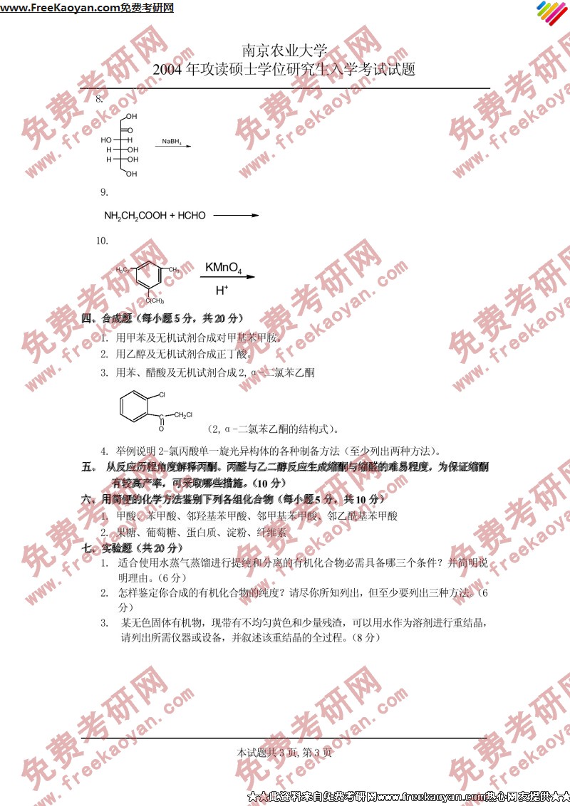 南京农业大学2004年考研真题-有机化学(3)