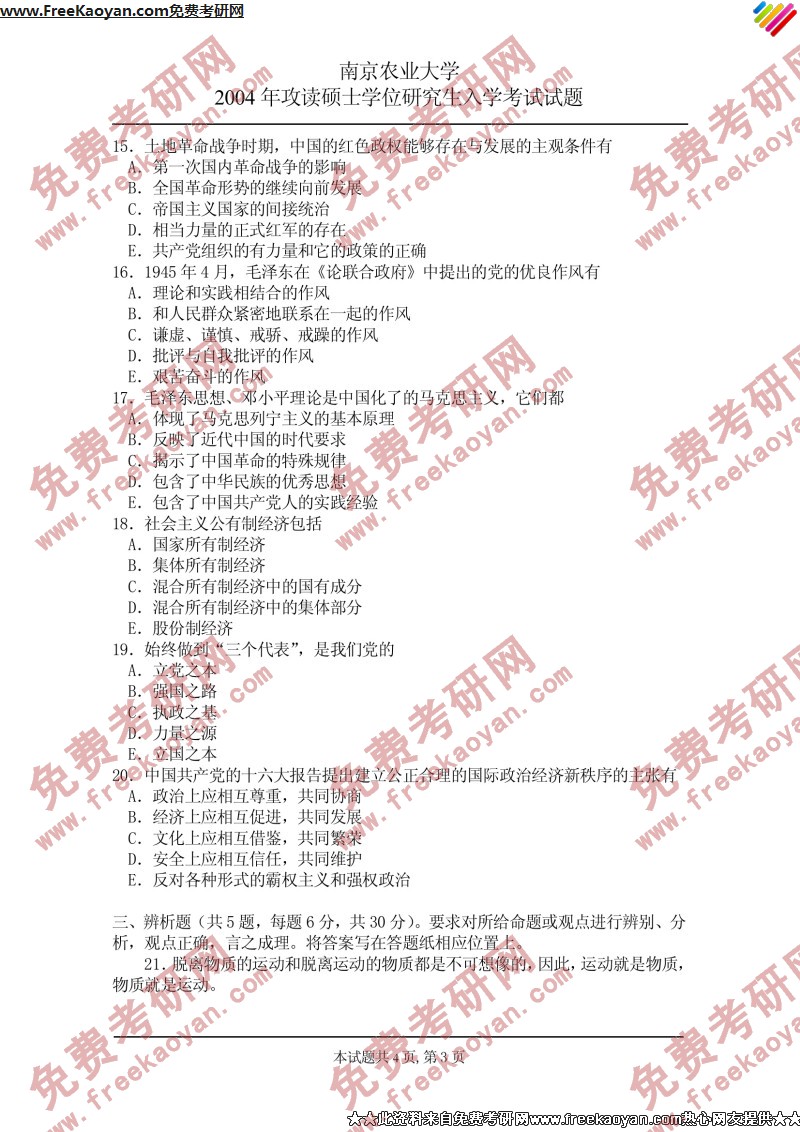 专业课考研经验 本站小编 FreeKaoyan 2018-01-23南京农业大学2004年考研真题-哲学基础