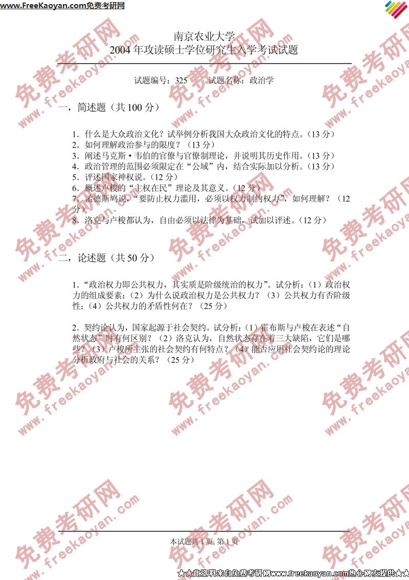 相关话题/南京农业大学 考研真题 政治学