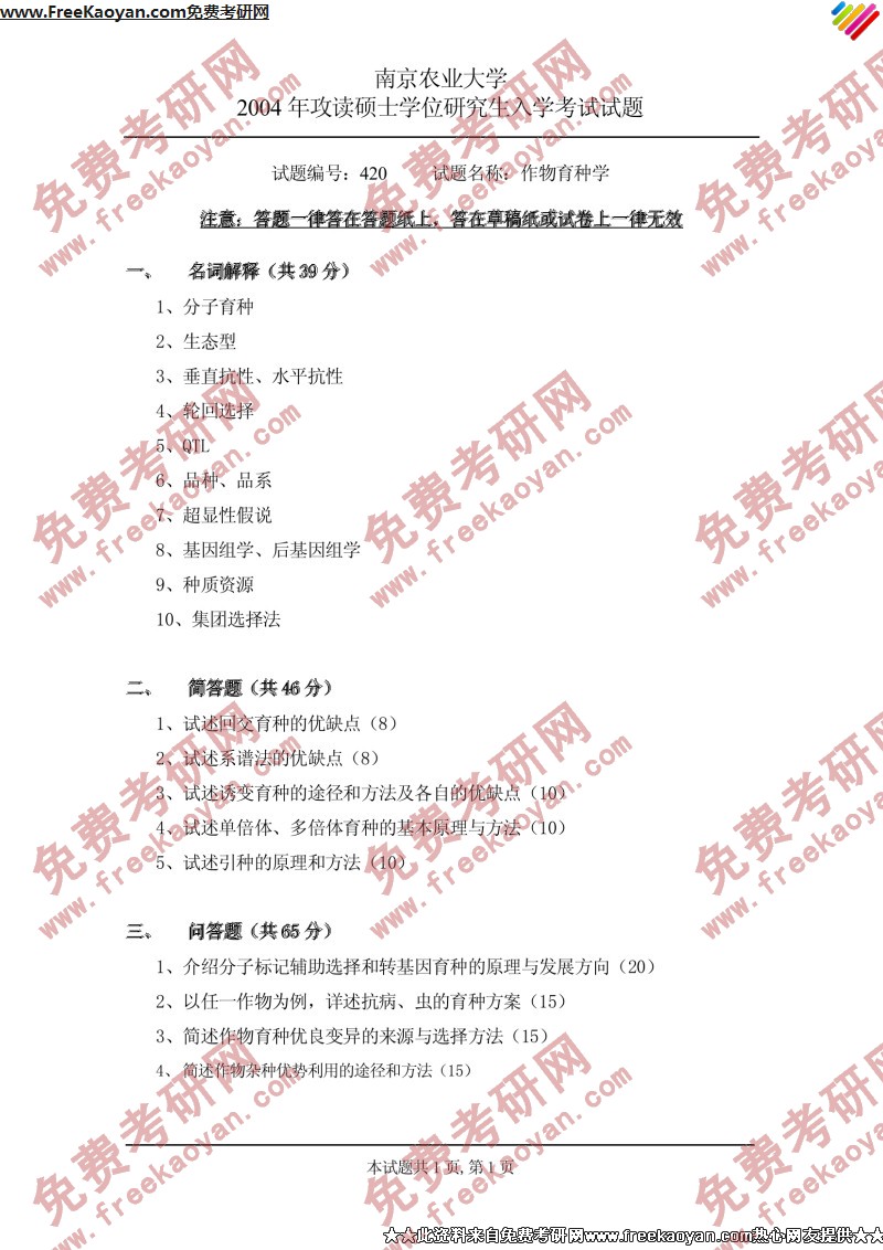 专业课考研经验 本站小编 FreeKaoyan 2018-01-23南京农业大学2004年考研真题-遗传学