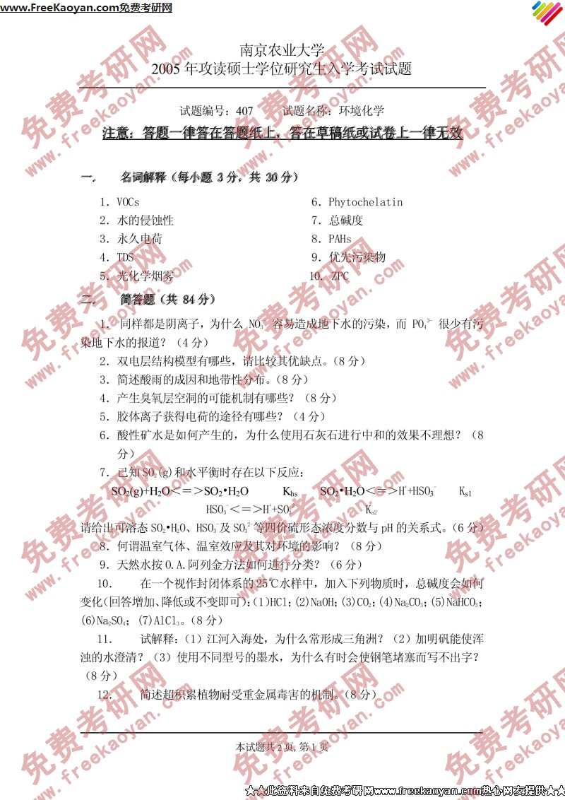 专业课考研经验 本站小编 FreeKaoyan 2018-01-23南京农业大学2005年考研真题-化学