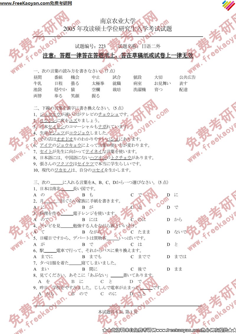 专业课考研经验 本站小编 FreeKaoyan 2018-01-23南京农业大学2005年考研真题-基础英语