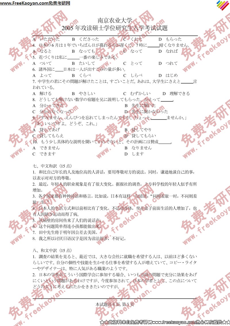 专业课考研经验 本站小编 FreeKaoyan 2018-01-23南京农业大学2005年考研真题-基础英语
