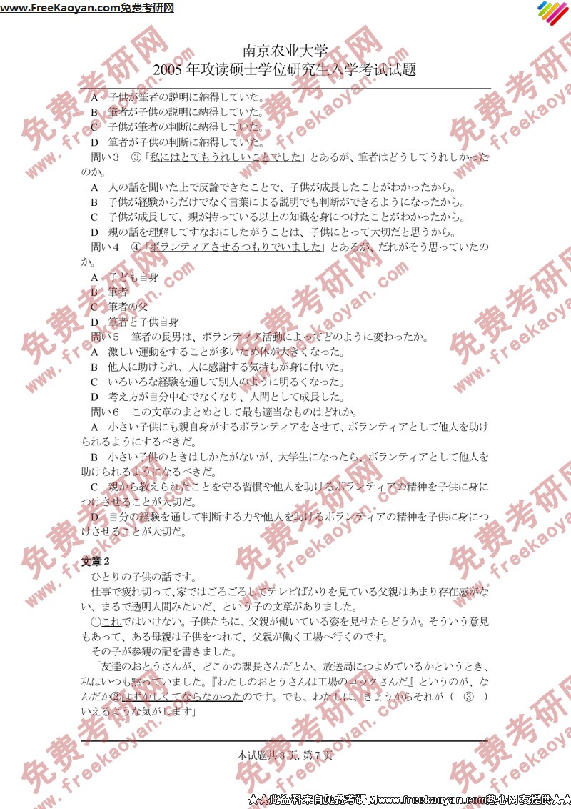 南京农业大学2005年考研真题-日语二外(7)