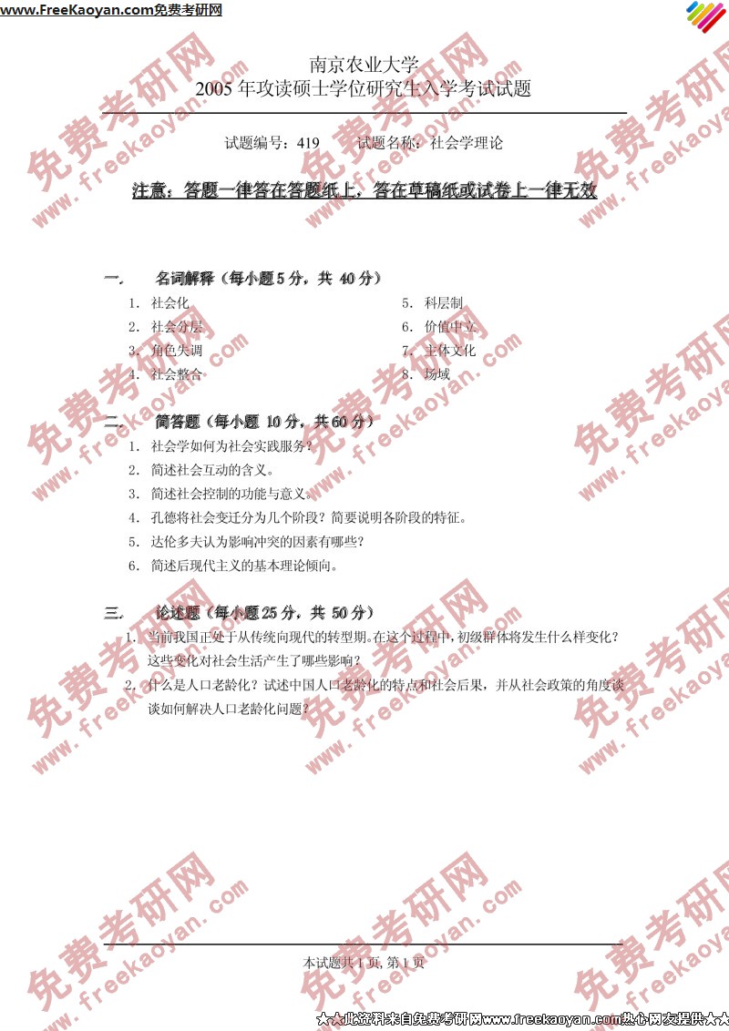 专业课考研经验 本站小编 FreeKaoyan 2018-01-23南京农业大学2005年考研真题-化学