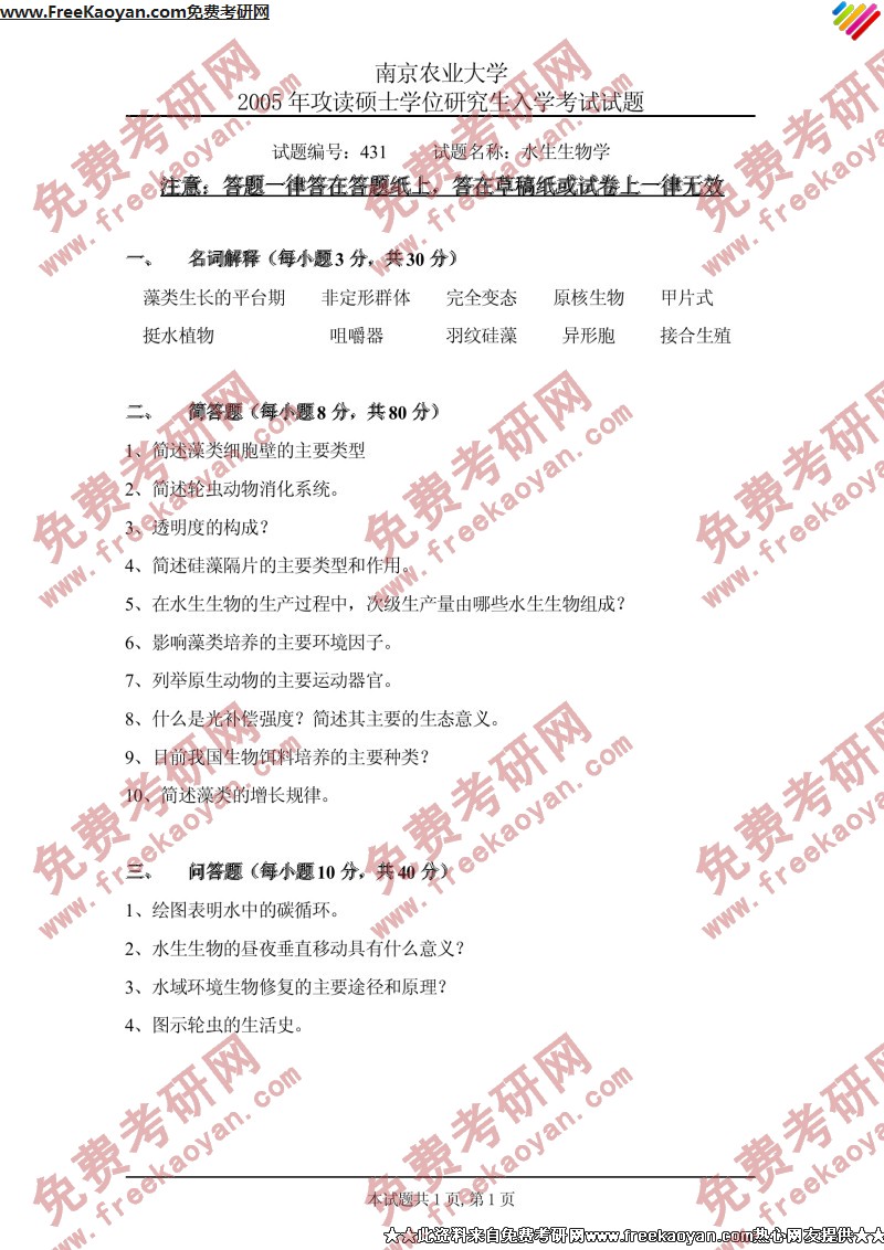 专业课考研经验 本站小编 FreeKaoyan 2018-01-23南京农业大学2005年考研真题-化学