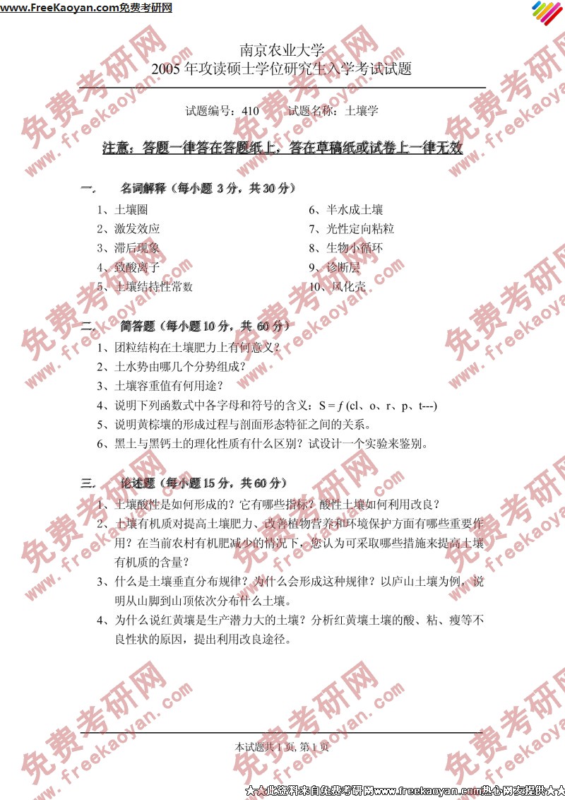 专业课考研经验 本站小编 FreeKaoyan 2018-01-23南京农业大学2005年考研真题-环境科学导论