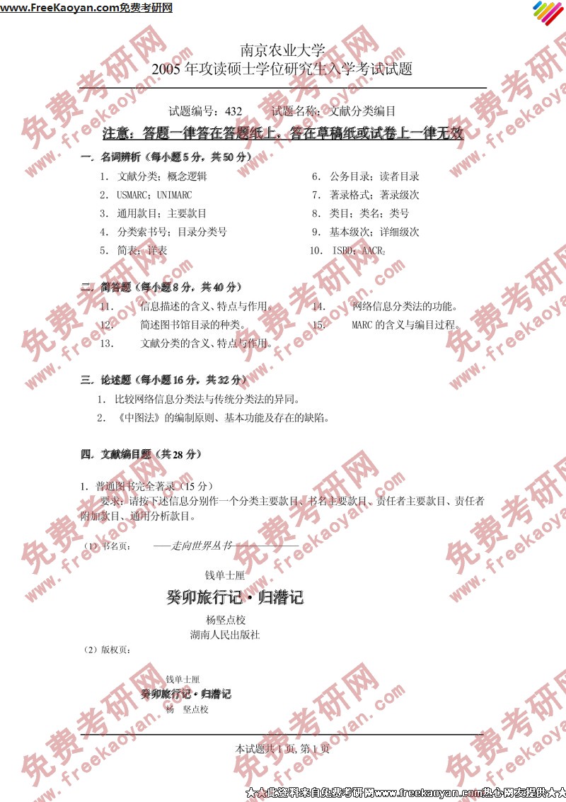 南京农业大学2005年考研真题-文献分类编目