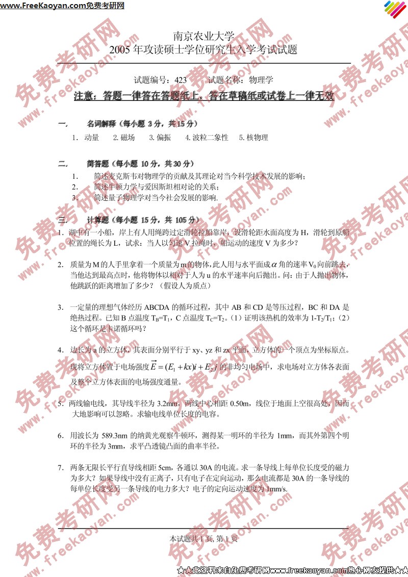 专业课考研经验 本站小编 FreeKaoyan 2018-01-23南京农业大学2005年考研真题-基础英语