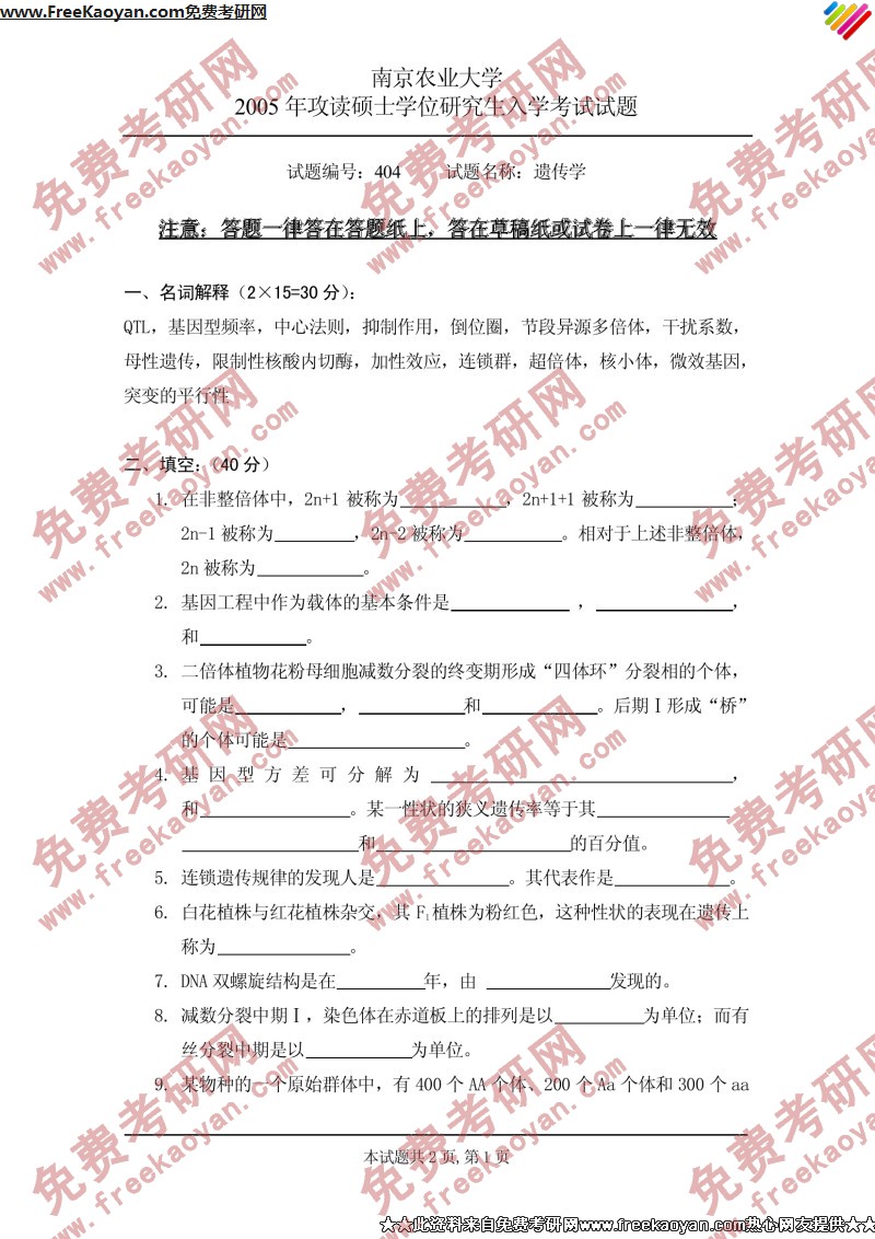 专业课考研经验 本站小编 FreeKaoyan 2018-01-23南京农业大学2005年考研真题-生物化学