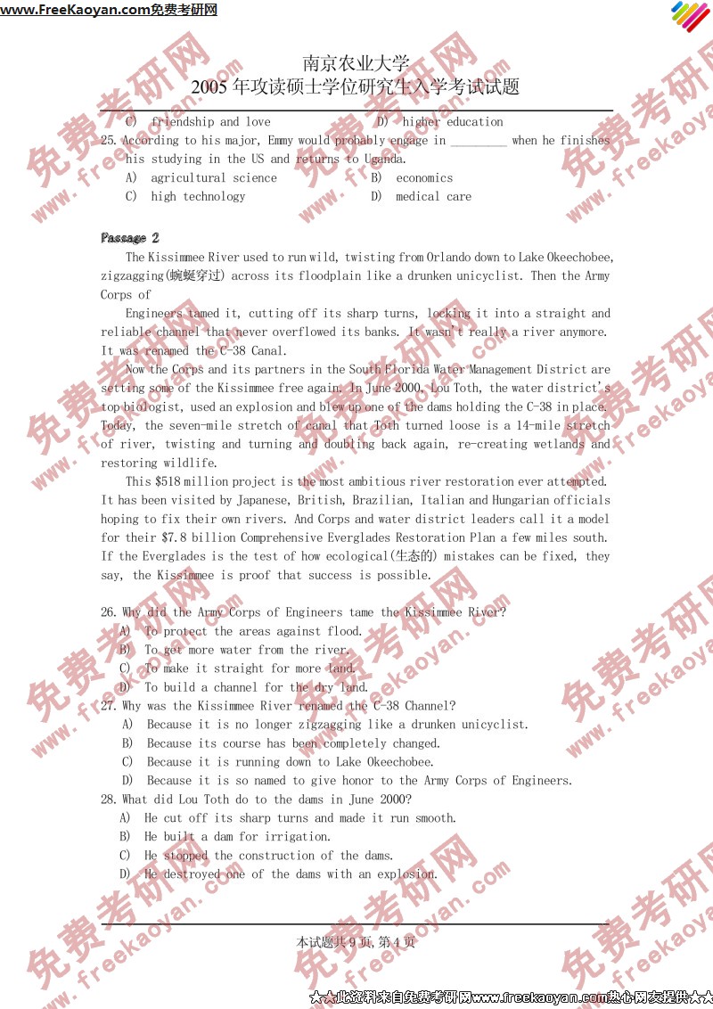 专业课考研经验 本站小编 FreeKaoyan 2018-01-23南京农业大学2005年考研真题-英语(单)