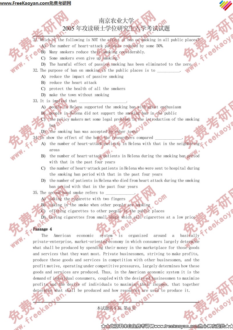 专业课考研经验 本站小编 FreeKaoyan 2018-01-23南京农业大学2005年考研真题-英语(单)