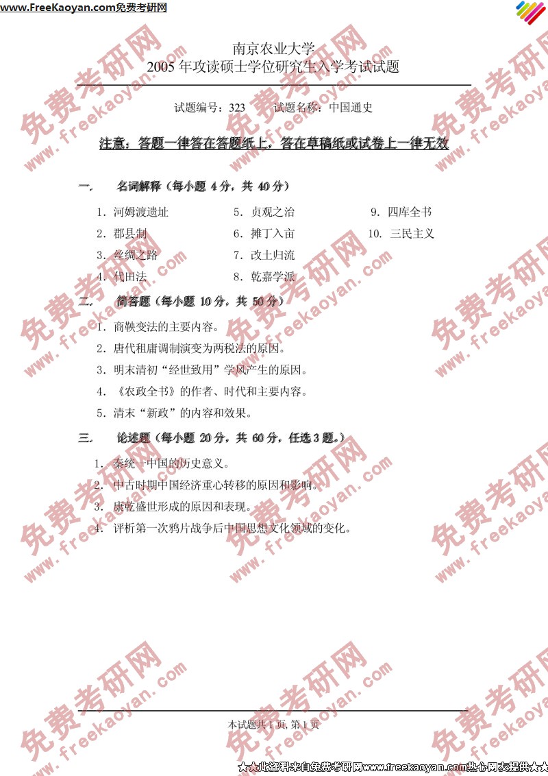 南京农业大学2005年考研真题-中国通史
