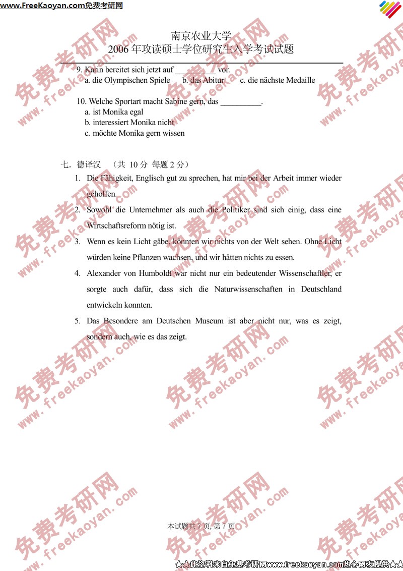 南京农业大学2006年考研真题-德语二外(7)