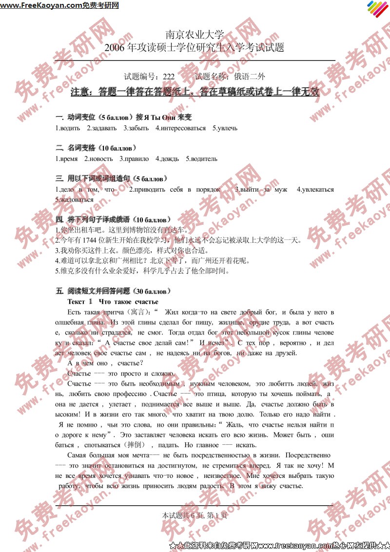 专业课考研经验 本站小编 FreeKaoyan 2018-01-23南京农业大学2006年考研真题-德语二外