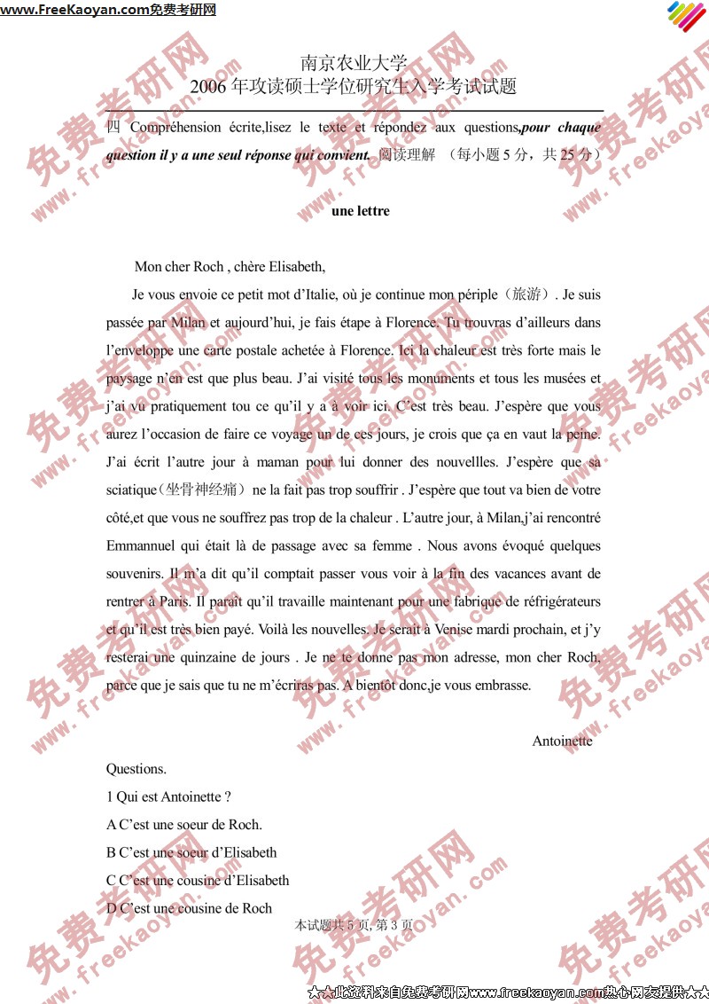 专业课考研经验 本站小编 FreeKaoyan 2018-01-23南京农业大学2006年考研真题-德语二外