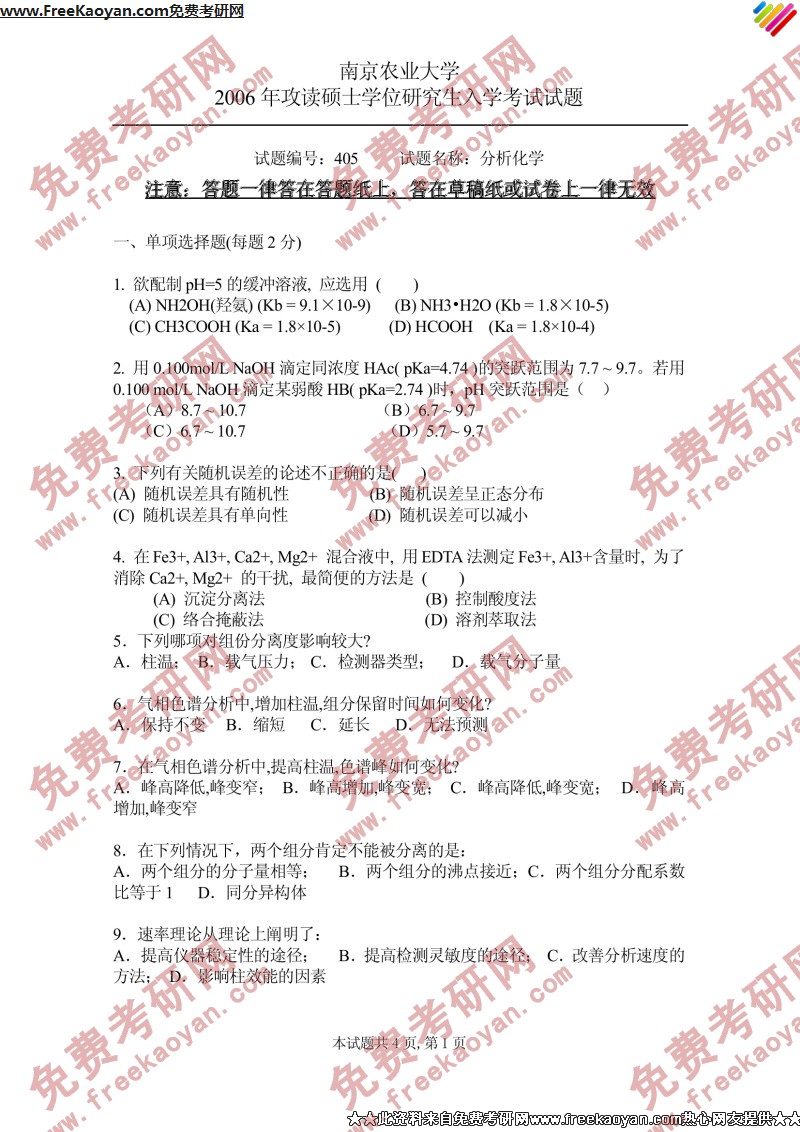 专业课考研经验 本站小编 FreeKaoyan 2018-01-23南京农业大学2006年考研真题-动物生物化学