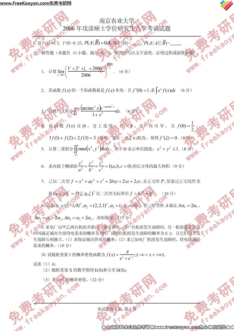 专业课考研经验 本站小编 FreeKaoyan 2018-01-23南京农业大学2006年考研真题-分析化学