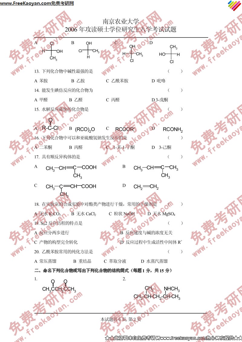 专业课考研经验 本站小编 FreeKaoyan 2018-01-23南京农业大学2006年考研真题-分析化学