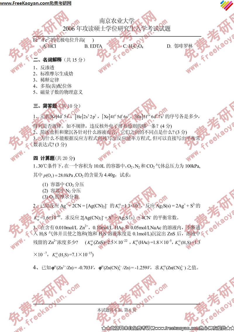 专业课考研经验 本站小编 FreeKaoyan 2018-01-23南京农业大学2006年考研真题-分析化学