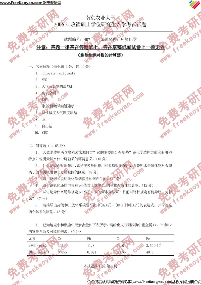 专业课考研经验 本站小编 FreeKaoyan 2018-01-23南京农业大学2006年考研真题-分析化学