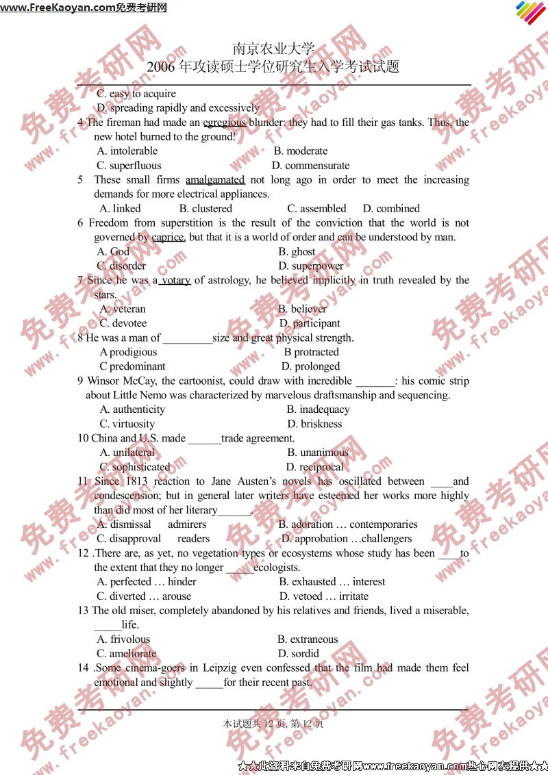 专业课考研经验 本站小编 FreeKaoyan 2018-01-23南京农业大学2006年考研真题-法语二外