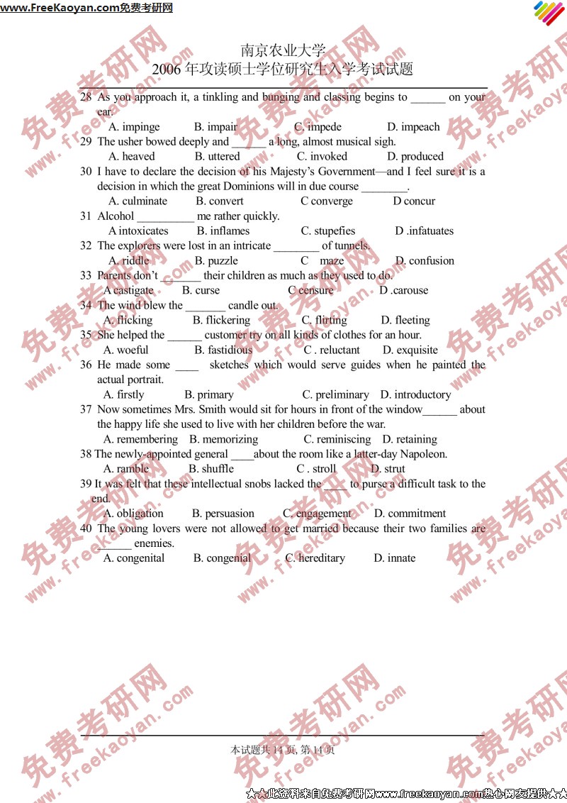 南京农业大学2006年考研真题-基础英语(14)