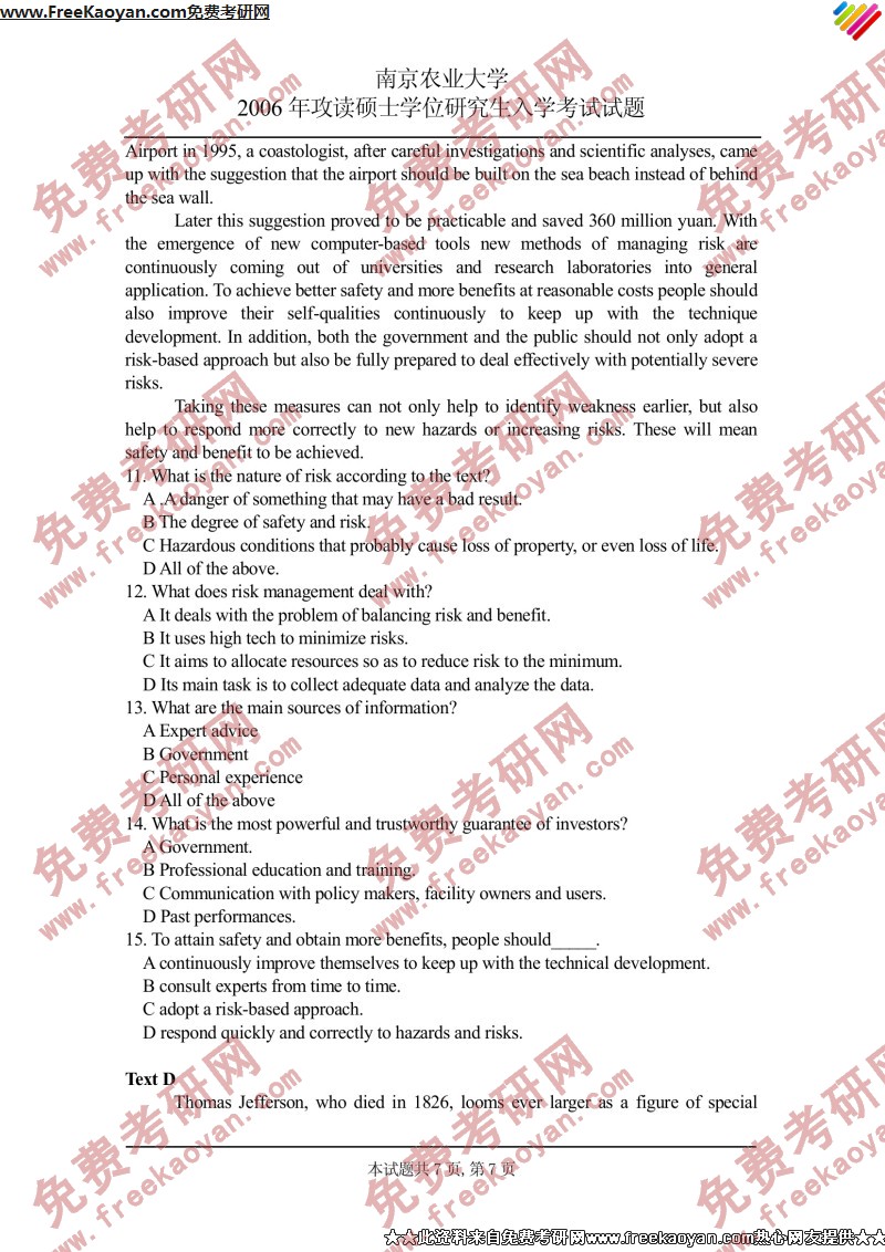 专业课考研经验 本站小编 FreeKaoyan 2018-01-23南京农业大学2006年考研真题-法语二外